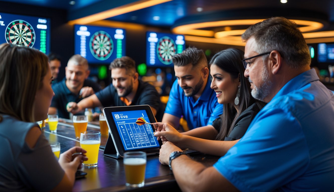 Orang-orang sedang bertaruh secara langsung pada permainan dart di sebuah bar dengan papan dart dan perangkat digital.