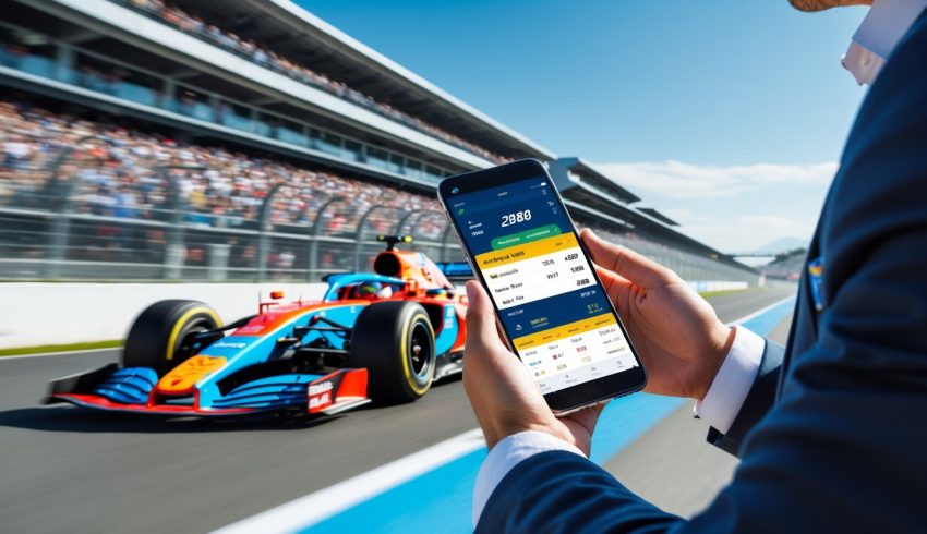 Mobil Formula 1 melaju cepat di lintasan balap dengan penonton di tribun dan seorang pria memegang ponsel yang menampilkan aplikasi taruhan balapan.